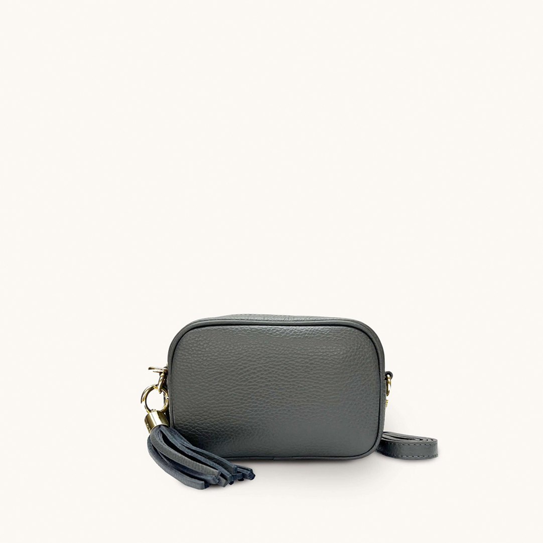 The Mini Tassel Dark Grey Leather Phone Bag is the perfect size for carrying essentials like your phone and cardholder, featuring a stylish leather tassel and a detachable, fully adjustable strap. It fits all sizes of iPhone and is a mini version of our best-selling Tassel bag, proving the best things come in small packages.