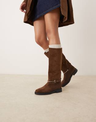 ASOS DESIGN Cole flat riding knee boots in chocolate suedette with trim-Brown