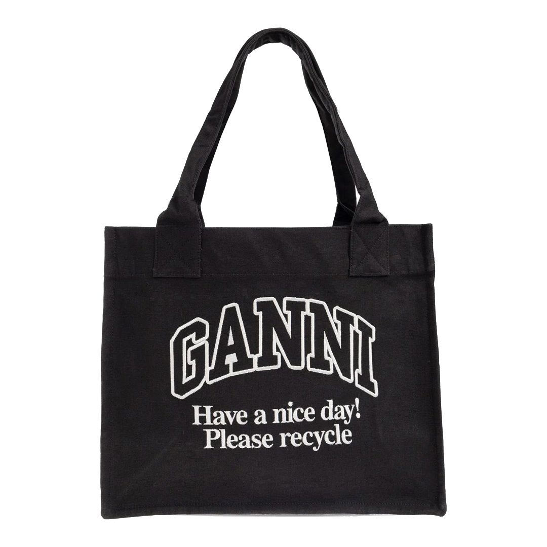 Black Ganni Recycled Cotton Large Tote BagElevate Your Everyday With This Recycled Cotton Large Tote Bag In Grey By Ganni. Crafted From 100% Recycled Cotton, This Oversized Shopper Epitomizes Effortless Sophistication And Urban Practicality. Its Generous Shape And Contrasted Logo Pocket Offer Both Statement Design And Exceptional Utility, Making It The Perfect Companion For Workdays, Weekend Escapes, And Everything In Between. Designed For Versatility And Environmental Consciousness, This Tote Bag Proves That Fashion And Function Can Coexist Seamlessly. Let This Essential Piece Become Your Go-To For Chic City Living And Planet-Friendly Style.Dimensions: 37 x 32 x 16 cmComposition: 100% Recycled CottonColour: Black