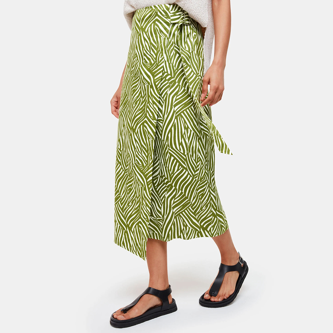 Green Linear Leaf Wrap Midi Skirt