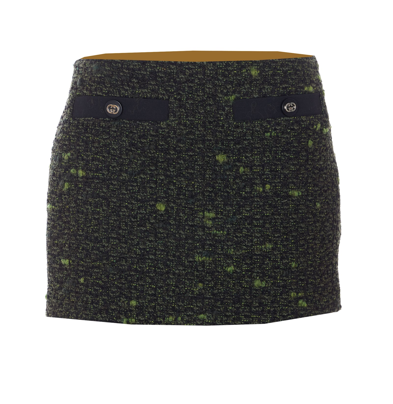 Gucci green tweed mini skirt, lateral zip closure, frontal GG logo detailComposition: 86% Wool, 10% Polyamide, 4% Polyester