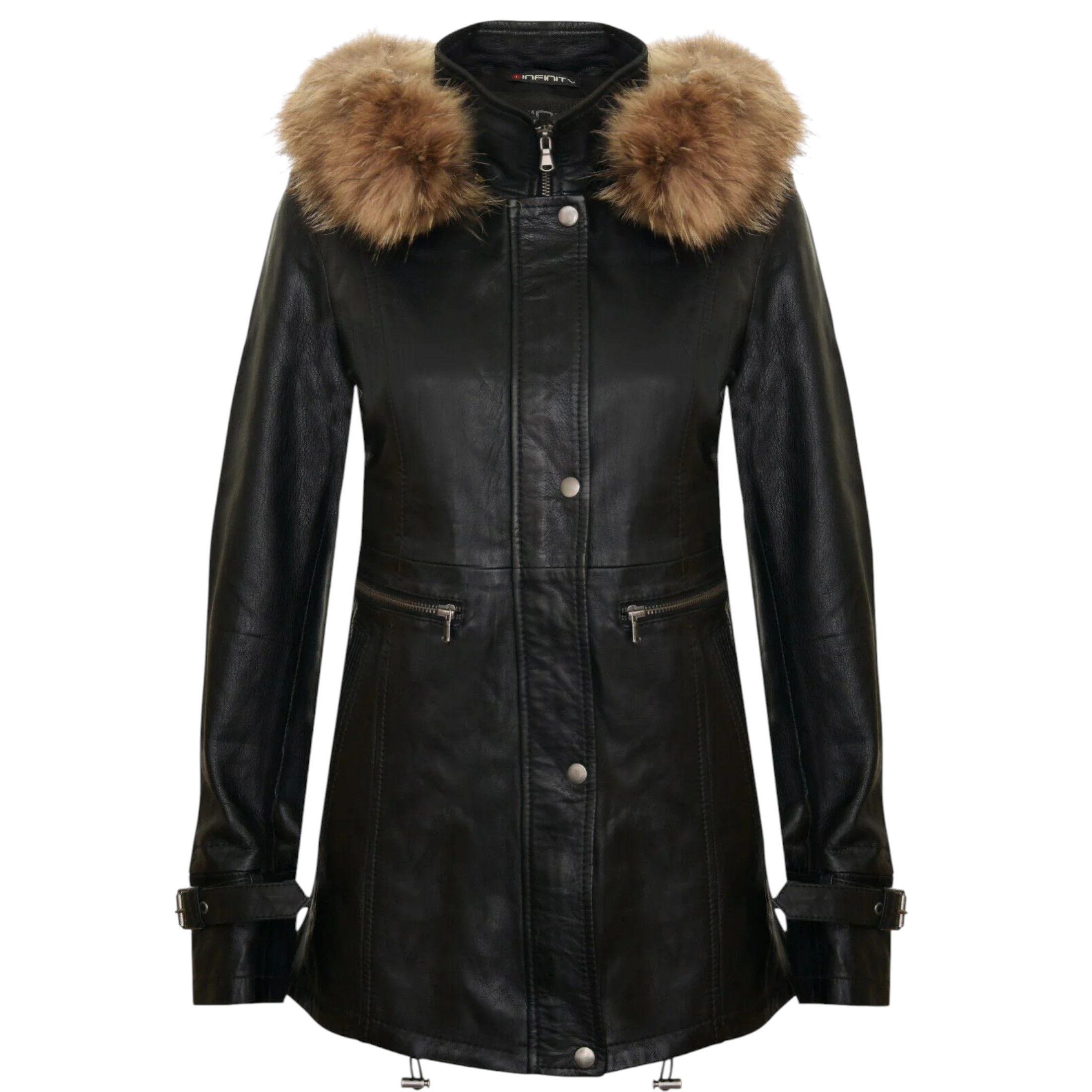 A chic parka which offers a more straightforward look than our Brussels style, for those who prefer more minimalistic and sophisticated fashion. This jacket comes with a fur lined hood, great for the winter due to its warmth and comfort whilst being a stylish addition to this piece. This jacket features a button fastened fly over the YKK zip closure which creates a more classic aesthetic. We’ve also added buckles to the cuffs for added adjustability to ensure that the sleeves remain breathable during all day use, as well as two extended horizontal zips that runs across the waist to provide plenty of storage.100% premium ultra-soft nappa leatherFeatures detachable fur hood, two large exterior pockets and adjustable cuffsHigh funnel collar which can be fastened with a full length YKK zipper