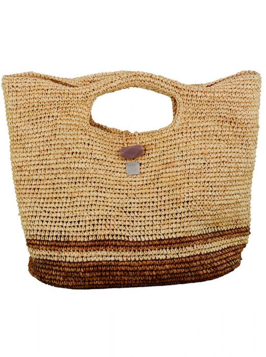 The St Tropez designer beach bag is hand made from natural raffia straw, in two tone neutral colouring with stylish rolled top handles and finished with a stone fasteningThe St Tropez bag is hand-made from natural raffia straw, in two tone neutral colouring with stylish rolled top handles. It is the perfect bag to complement your look, whether at the beach, pool side or resort. Completed with a beautiful stone fastening, inner pocket and unlined interiorit’s a summer must have!