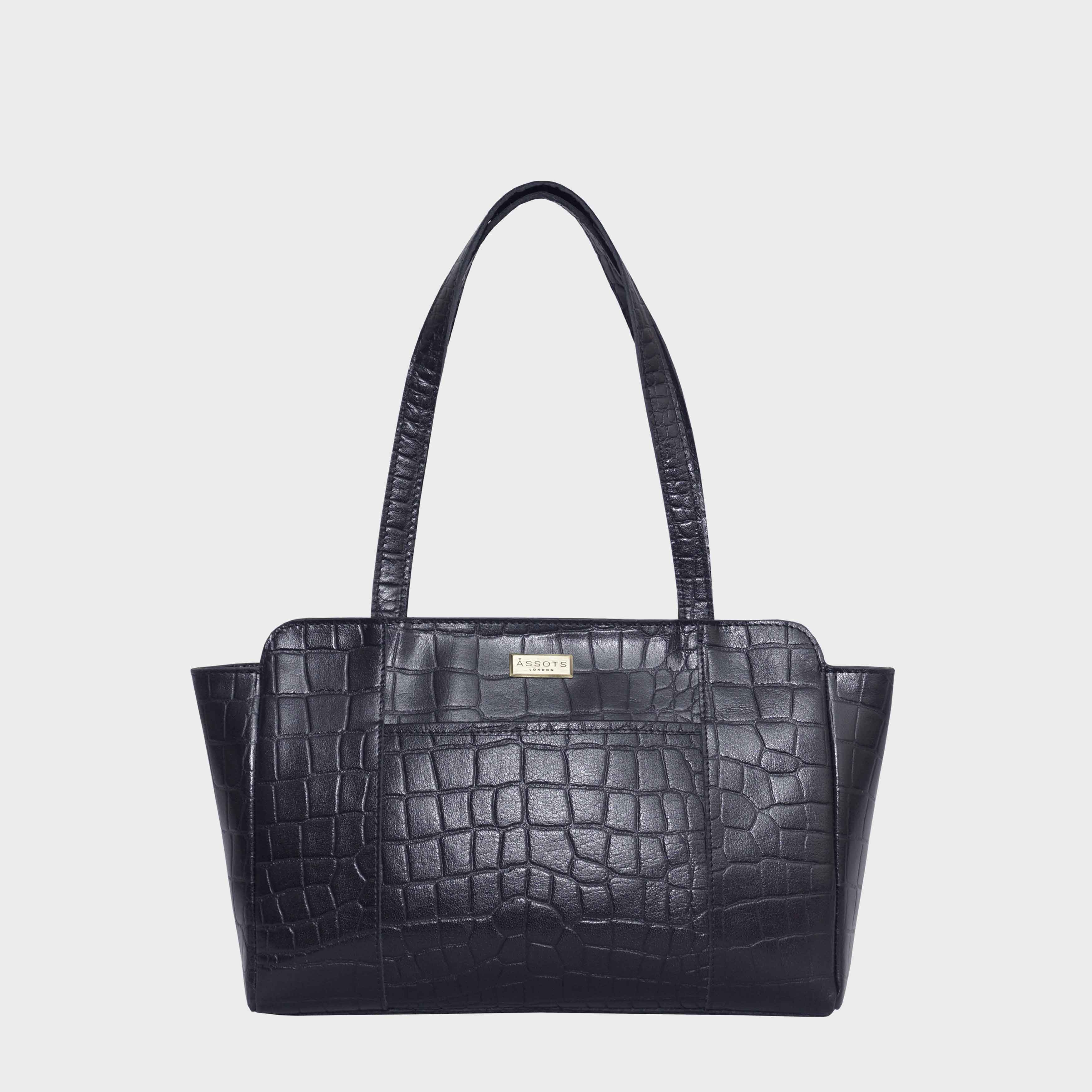 The practical and timeless ‘Judith’ real leather shoulder bag is beautifully handcrafted from vintage real croc polished finish leather. A classic boat design featuring multiple zip and slip pockets to organise all your essentials when you’re out and about. Ideal for everyday use this genuine leather piece is a must-have addition to your collection of handbags.Zip closure opens to a fully lined spacious interior to accommodate all your essentials. The lining used is the signature Assots London branded polyester mix fabric. Secured full-width zip pocket at the back and slip pocket at the front to slide in your essentials. Leather shoulder handles for a comfortable carry and easy pickup and go. Adorned with the inimitable Assots London metal logo for a clean finish. Additional internal zip pocket and two slip-in pockets for your face covering house keys car keys and sunglasses. Fittings colour: Antique brass. Composition: Body: 100% Genuine Leather. Lining: Polyester.DISCLAIMER : All pictures shown are for illustration purpose only. Actual product colour may vary due to different ambience lighting or the screen display settings.