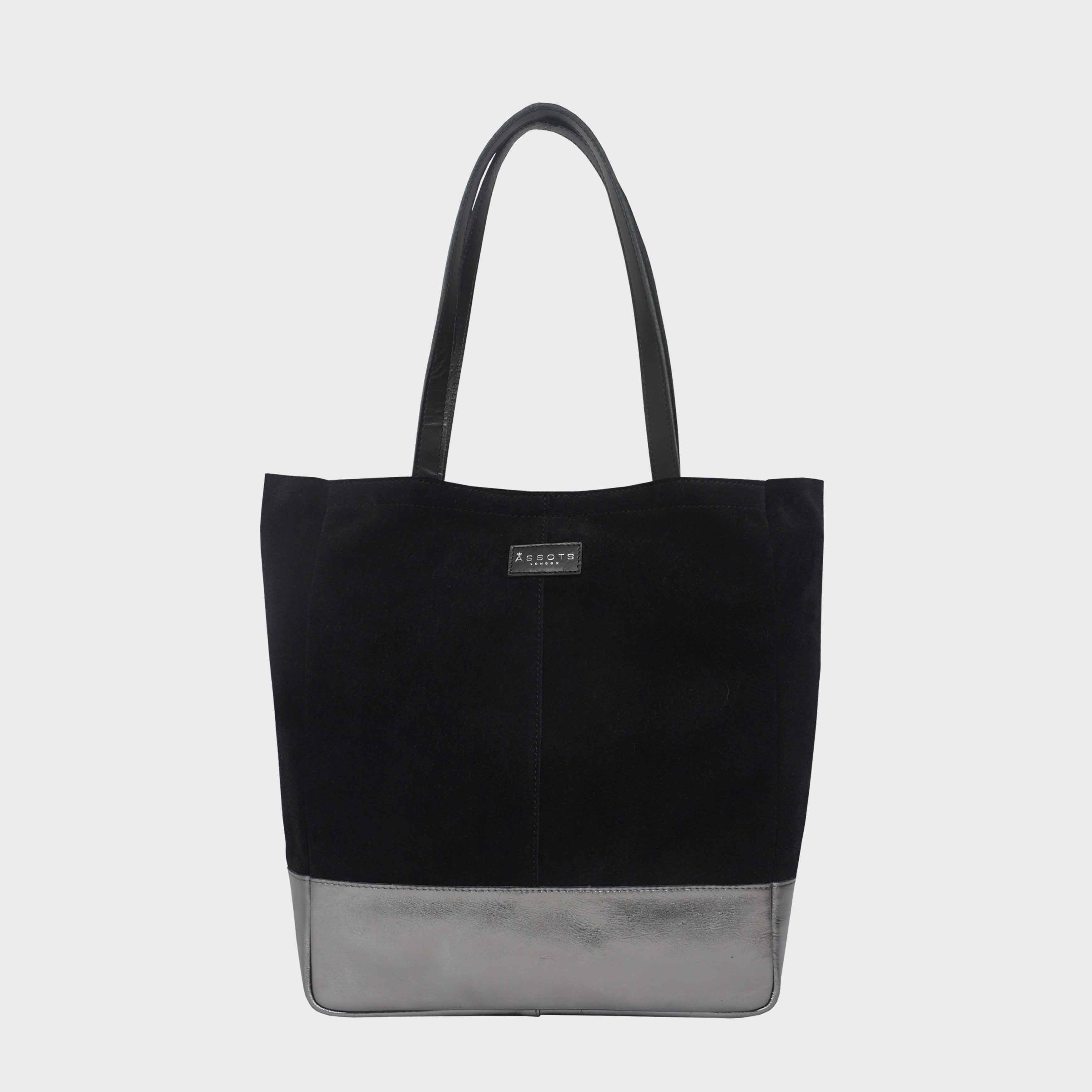 The Assots ‘Paige’ designer leather tote bag is beautifully handcrafted with real fine napped suede leather with matching metallic leather. Ideal for all occasions – party work or travel this slouchy tote bag adds a touch of sophistication to all your outfits while keeping all things organised. The multi-functional ‘Paige’ is a must-have genuine leather handbag for the modern and classy woman. Secured magnetic closure opens to a spacious and roomy interior accommodating all your essentials with ease. Unlined interiors to expose the natural look touch and feel of genuine leather. Long leather shoulder handles for a comfortable carry. Adorned with the inimitable Assots London silver embossed logo on the front. Fittings: Silver Nickel. Composition: Body: 100% Genuine Leather. Lining: Unlined.DISCLAIMER : All pictures shown are for illustration purpose only. Actual product colour may vary due to different ambience lighting or the screen display settings.