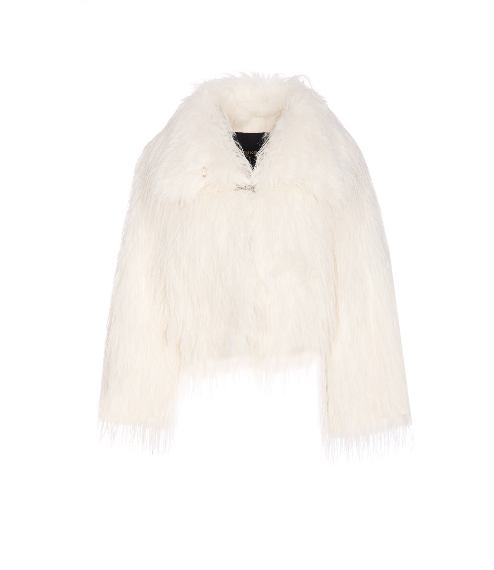Pinko white faux fur jacket, hooks closure, round neck, long sleeves, cropped model, lateral pockets,belt detailComposition: 100% Polyester