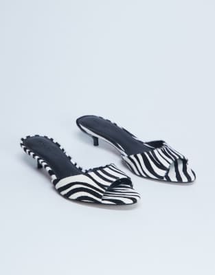 Shoes by Topshop These Alba mules are crafted from a textured fabric and feature a zebra print. This slip-on style has a peep toe and a kitten heel.