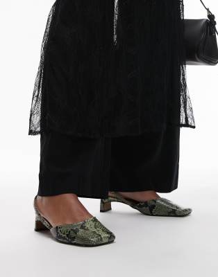 Topshop Diana square toe mid heeled shoes in khaki snake print-Green