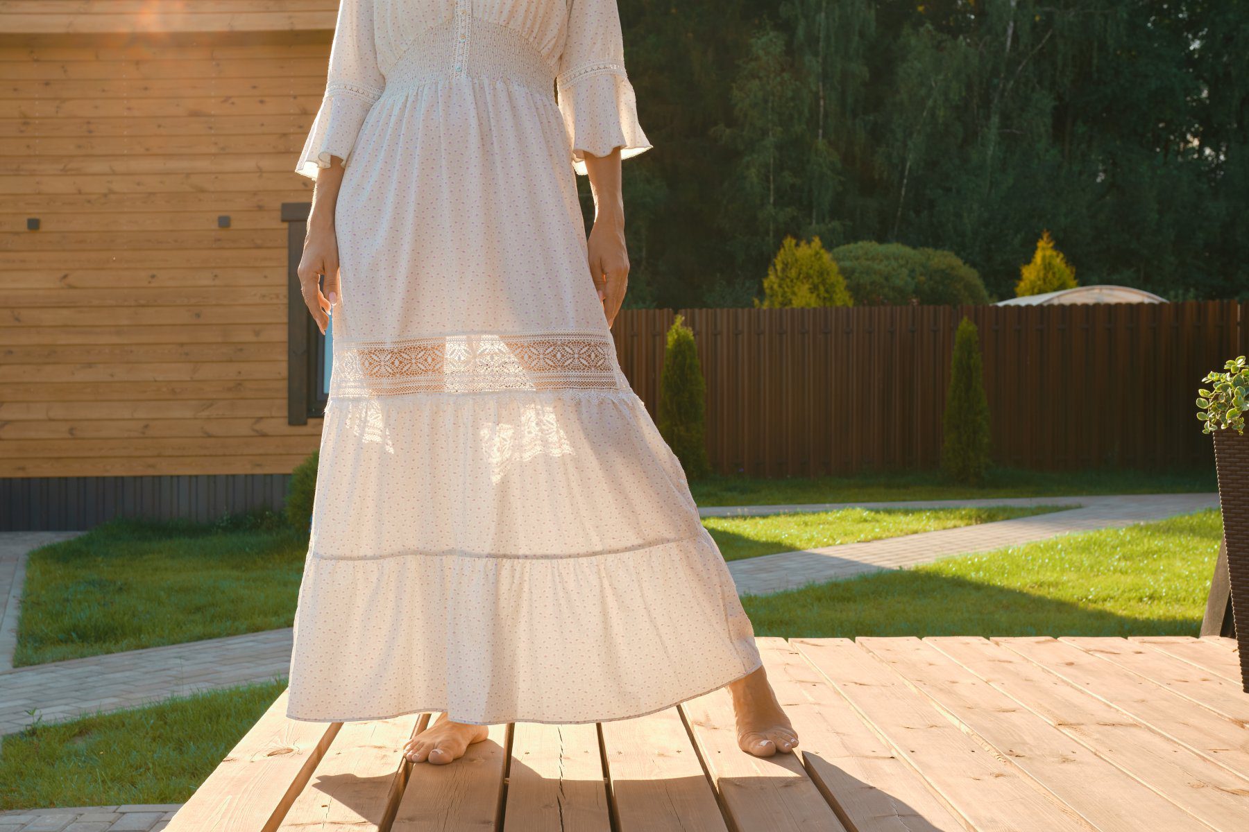 Let me be very clear about what this dress is for. It is for long lazy afternoons in someone’s garden. It is for outdoor summer parties where there’s no agenda and no particular hurry to be anywhere. It is absolutely not for anywhere that involves a lot of walking or any situation where you need to move quickly. And that’s fine, because worn in the right context — barefoot on a deck in the sunshine, prosecco in hand — a lace panel maxi in white is one of the most effortlessly beautiful things you can put on. Linen and cotton voile work brilliantly for this length because they move properly and don’t cling in the heat.