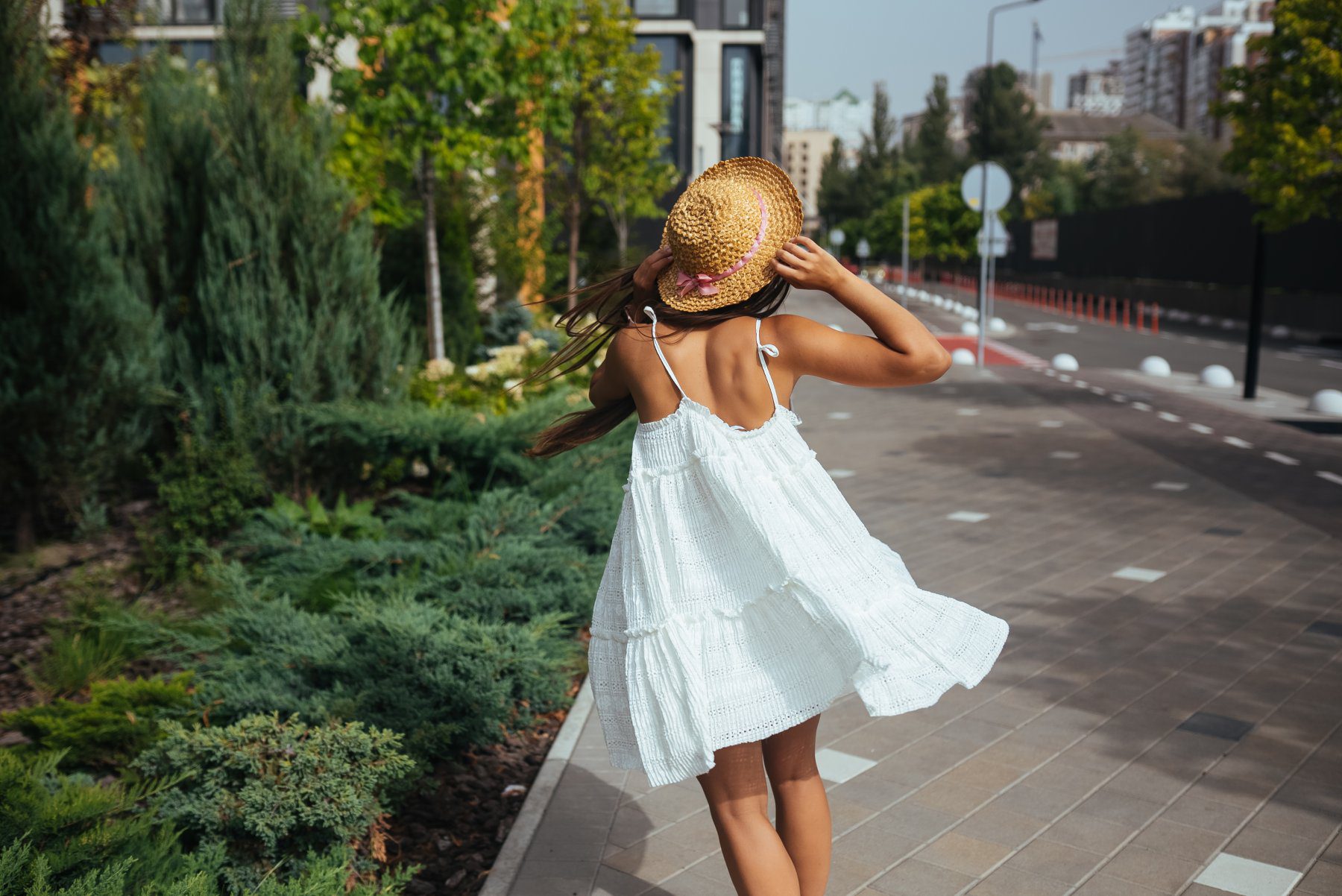 There’s something brilliant about a swing cut in white with a lace yoke detail — it manages to feel casual and a little bit special at the same time, which is a difficult balance to get right. This is the style I’d reach for on holiday for resort days, afternoon events, or anywhere you want freedom of movement without looking like you haven’t thought about what you’re wearing. The trainers here are a genuinely great call too. A common mistake with white dresses is feeling like every pair of shoes needs to be dressy, and this image is a good reminder that sometimes a clean white trainer is exactly the right answer.