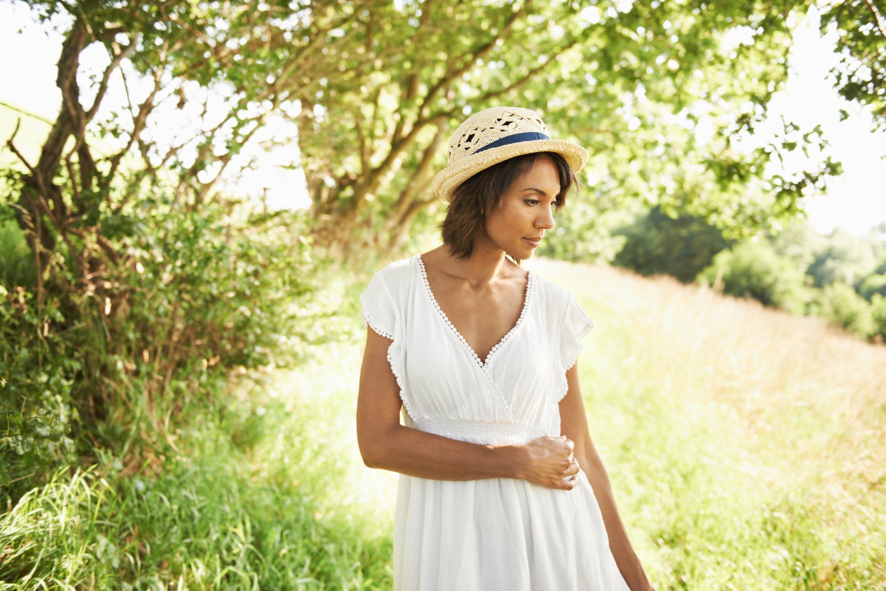 Possibly the most useful white dress that exists. The midi length combined with a puff or structured sleeve flatters almost every body type, and broderie fabric has enough texture to make the whole thing feel complete without much jewellery. This is my go-to for occasions that are too dressed-up for jeans but not formal enough to justify anything approaching evening wear — harbour side dinners on holiday, birthday lunches, that sort of thing. The accessories in this image are doing something very clever too. Warm brown leather, rattan, strappy sandals in a tan tone. That combination with white is one of those things that just works every single time.
