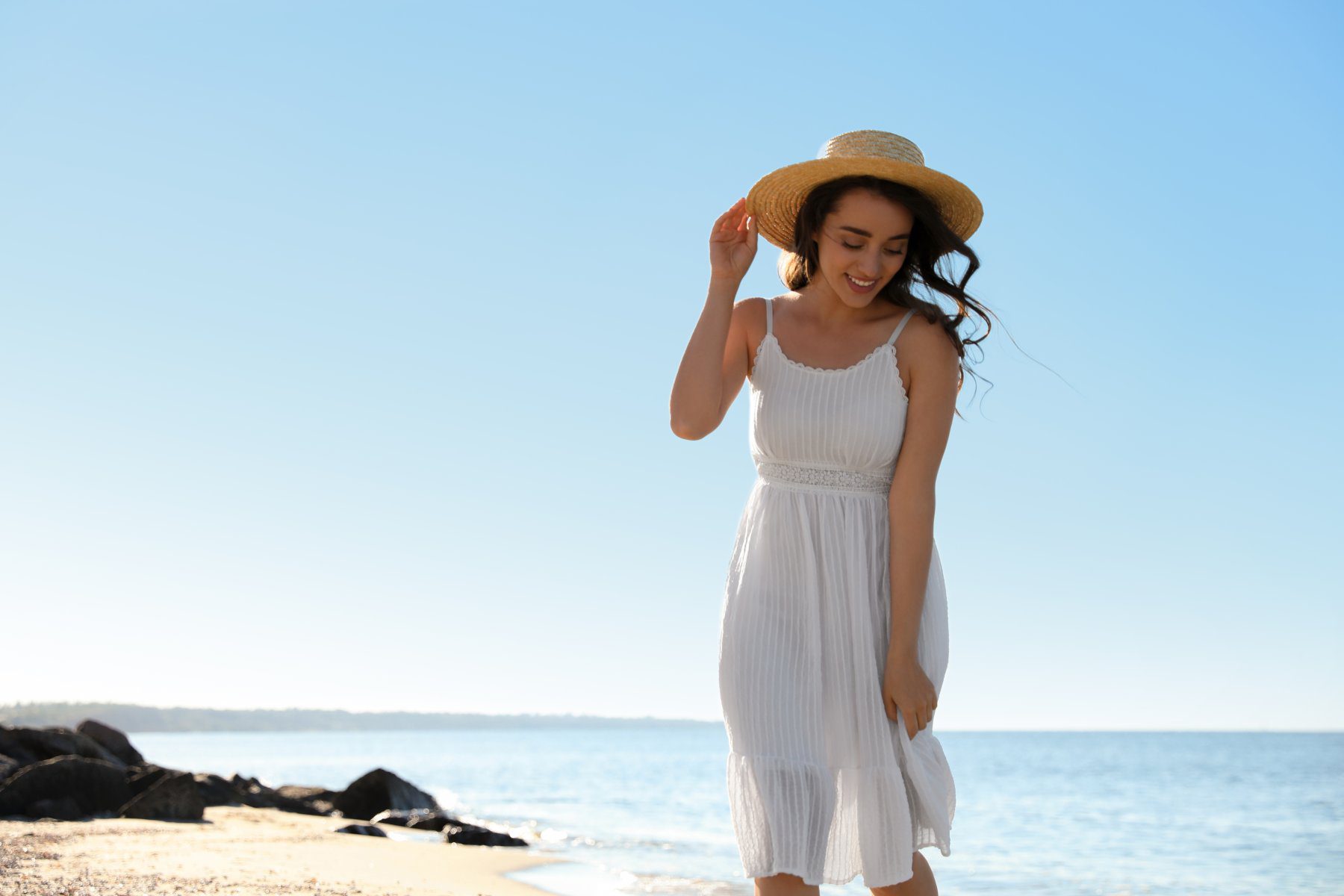 Your holiday essential. Pack this first, full stop. The beauty of a simple strappy white dress in a good quality cotton is that it genuinely works across every situation a holiday throws at you. Beach to bar, poolside to evening stroll, casual lunch to somewhere slightly nicer than you were expecting. That subtle pleated texture and lace waist detail here keeps it from feeling too basic, which is the risk with very simple cuts in white. The straw hat combination is practically a uniform at this point and I mean that as the highest compliment. Some things become classics for very good reasons.